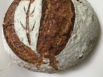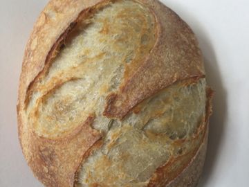 This loaf has a chewy inside and wonderful crust with a robust sourdough flavor. The loaf can be round or oblong, as long as requested in advanc