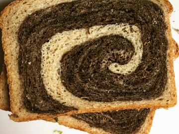 Pictured is a beautiful light and dark rye swirled rye loaf