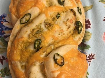 Cheesy spicy goodness your thing? Then this is the bread for you! It is loaded with cheddar cheese and Jalapenos. Can be made as pictured or in a sandwich loaf for slicing.